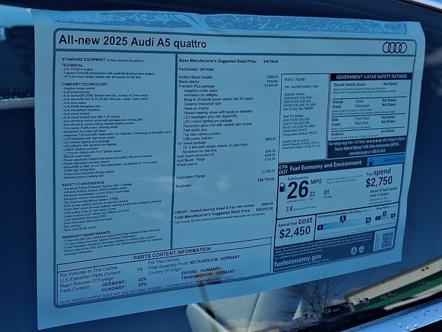 We Are Audi State College, your premier Audi dealer in State College, Pennsylvania, we're proud to offer a stunning selection of the latest Audi models, backed by exceptional customer service and unbeatable deals. Whether you're looking for the dynamic Audi A3, the sleek Audi A4, the luxurious Audi A6, or the performance-driven Audi S5, we have something to meet every need. Explore the sophisticated Audi Q3, the versatile Audi Q5, or the commanding Audi Q7. For those seeking cutting-edge innovation, the Audi Q8 and the all-electric Audi e-tron are ready to impress. Plus, experience the exhilarating power of the Audi RS5, Audi S7, and more. As a proud member of the Ciocca Automotive family, we offer attractive lease options and specials tailored to fit your budget. Whether you're interested in financing or leasing a new Audi, our team is here to help you find the perfect vehicle. Visit us today at Audi State Collegeâ"your destination for new Audi vehicles in State College. Drive home in your dream Audi today! Price includes: $3000 - Customer Credit Lock Program. Exp. 04/30/2026