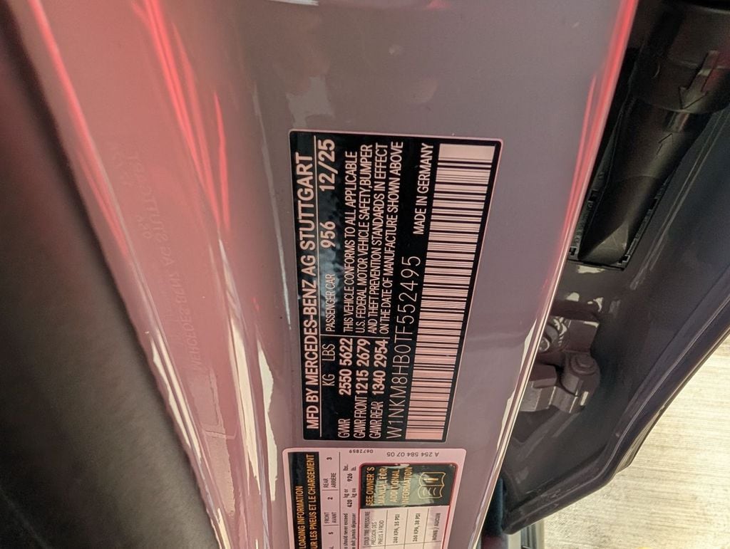 11.9" Center Touchscreen Display, 4-Wheel Disc Brakes, 8 Speakers, ABS brakes, Adaptive suspension, Air Conditioning, Alloy wheels, AM/FM radio: SiriusXM, Apple CarPlay®/Android Auto®, Auto High-beam Headlights, Auto tilt-away steering wheel, Auto-dimming door mirrors, Auto-dimming Rear-View mirror, Auto-leveling suspension, Automatic temperature control, Brake assist, Bumpers: body-color, Child-Seat-Sensing Airbag, Compass, Delay-off headlights, Driver door bin, Driver vanity mirror, Dual front impact airbags, Dual front side impact airbags, Electronic Stability Control, Emergency communication system: eCall Emergency System, Exterior Parking Camera Rear, Four wheel independent suspension, Front anti-roll bar, Front Bucket Seats, Front Center Armrest, Front dual zone A/C, Front reading lights, Fully automatic headlights, Garage door transmitter: HomeLink, Genuine wood dashboard insert, Head restraints memory, Heated door mirrors, Heated front seats, Heated steering wheel, Illuminated entry, Knee airbag, Leather steering wheel, Low tire pressure warning, MB-Tex/Microfiber Upholstery, Memory seat, Occupant sensing airbag, Outside temperature display, Overhead airbag, Overhead console, Panic alarm, Passenger door bin, Passenger vanity mirror, Power adjustable front head restraints, Power door mirrors, Power driver seat, Power Heated Front Bucket Seats, Power Liftgate, Power moonroof: Panoramic, Power passenger seat, Power steering, Power windows, Premium audio system: MBUX, Radio data system, Radio: 3rd Generation MBUX, Rain sensing wipers, Rear anti-roll bar, Rear fog lights, Rear reading lights, Rear seat center armrest, Rear window defroster, Rear window wiper, Remote keyless entry, Security system, SiriusXM Satellite Radio, Speed control, Speed-sensing steering, Split folding rear seat, Spoiler, Sport steering wheel, Steering wheel memory, Steering wheel mounted audio controls, Tachometer, Telescoping steering wheel, Tilt steering wheel, Traction control, Trip computer, Turn signal indicator mirrors, Variably intermittent wipers, Wheels: 20" AMG® Twin 10-Spoke, Wireless Android Auto®, Wireless Apple CarPlay®. Price includes: $2000 - Mercedes-Benz Regional Cash Program. Exp. 03/31/2026