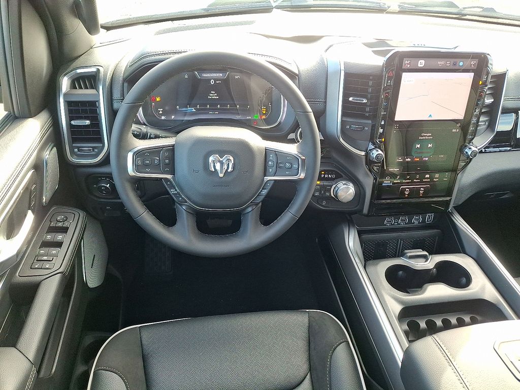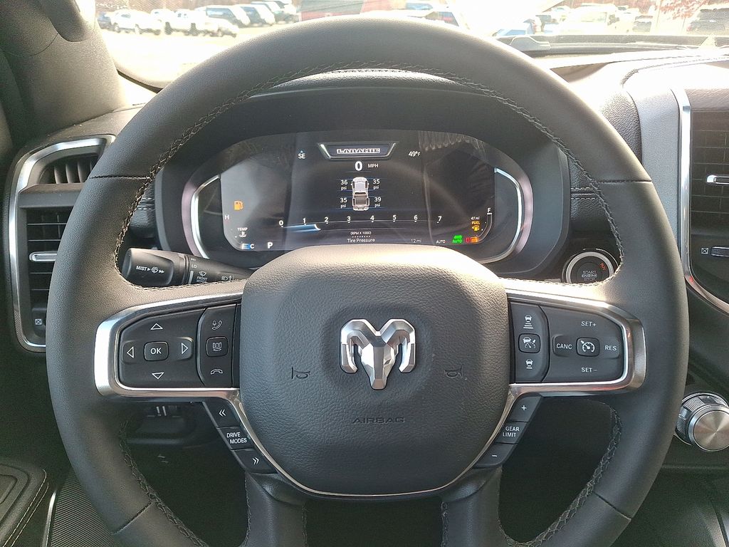 Inside, the Laramie's cabin exudes sophistication with premium leather-trimmed seats, heated and ventilated front seats, and a heated steering wheel. The dual-pane panoramic sunroof floods the interior with natural light, creating an airy, spacious atmosphere.
