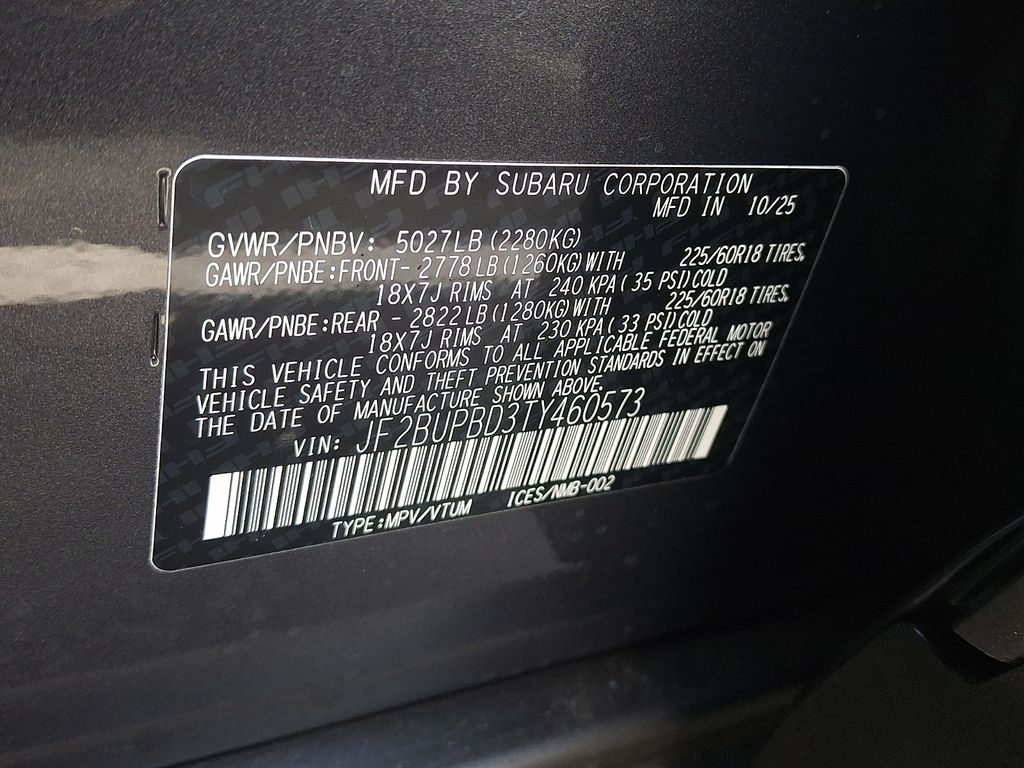 4-Wheel Disc Brakes, 6 Speakers, ABS brakes, Air Conditioning, Alloy wheels, AM/FM radio: SiriusXM with 360L, Anti-whiplash front head restraints, Auto High-beam Headlights, Auto-Dimming Mirror with Compass and HomeLink, Automatic temperature control, Blind Spot Warning, Brake assist, Bumpers: body-color, Cargo Net, Driver door bin, Driver vanity mirror, Dual front impact airbags, Dual front side impact airbags, Electronic Stability Control, Emergency communication system: MySubaru Companion (5-years free), Exterior Parking Camera Rear, Four wheel independent suspension, Front anti-roll bar, Front Bucket Seats, Front Center Armrest w/Storage, Front dual zone A/C, Front fog lights, Front reading lights, Fully automatic headlights, Heated door mirrors, Heated Front Bucket Seats, Heated front seats, HVAC memory, Illuminated entry, Knee airbag, Leather steering wheel, LED Upgrade, Low tire pressure warning, Navigation and Heated Steering Wheel and Moonroof, Occupant sensing airbag, Outside temperature display, Overhead airbag, Overhead console, Panic alarm, Partial Heated Steering Wheel, Passenger door bin, Passenger vanity mirror, Power door mirrors, Power driver seat, Power Liftgate, Power Moonroof, Power steering, Power windows, Radio: Subaru 12.1" Multimedia System, Radio: Subaru 12.1" Multimedia System with Navigation, Rain Sensor Windshield Wipers, Rear anti-roll bar, Rear Bumper Cover, Rear seat center armrest, Rear window defroster, Rear window wiper, Remote keyless entry, Security system, Speed control, Speed-sensing steering, Split folding rear seat, Spoiler, StarTex Upholstery, Steering wheel mounted audio controls, Tachometer, Telescoping steering wheel, Tilt steering wheel, Traction control, Trip computer, Turn signal indicator mirrors, Variably intermittent wipers, Wheels: 18" x 7J Aluminum-Alloy, Wireless Charger.